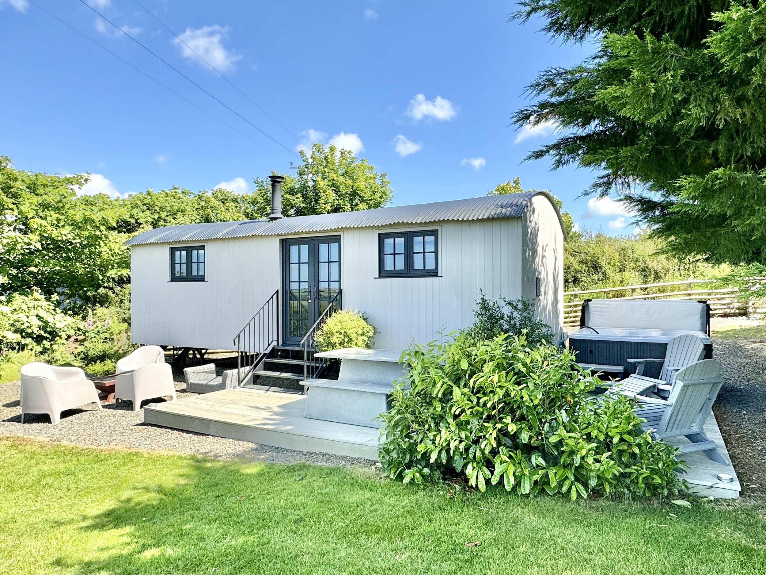 Two Shepherds’ Huts — Each with their own private hot tub, offering a cosy, stylish hideaway for a romantic or restorative escape.